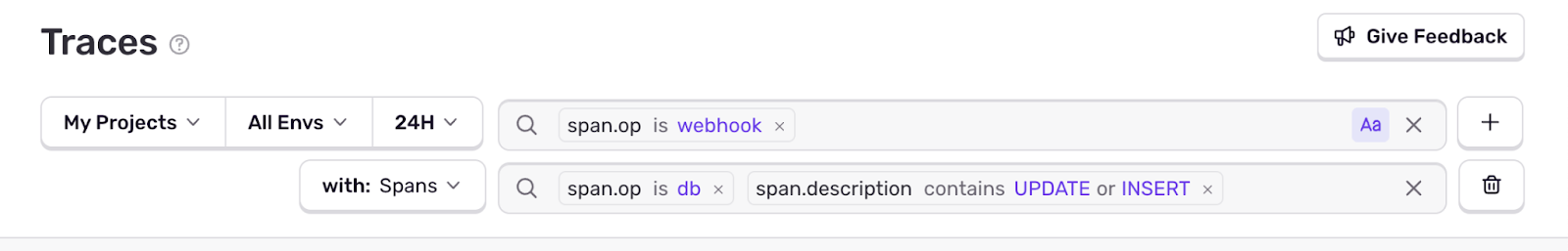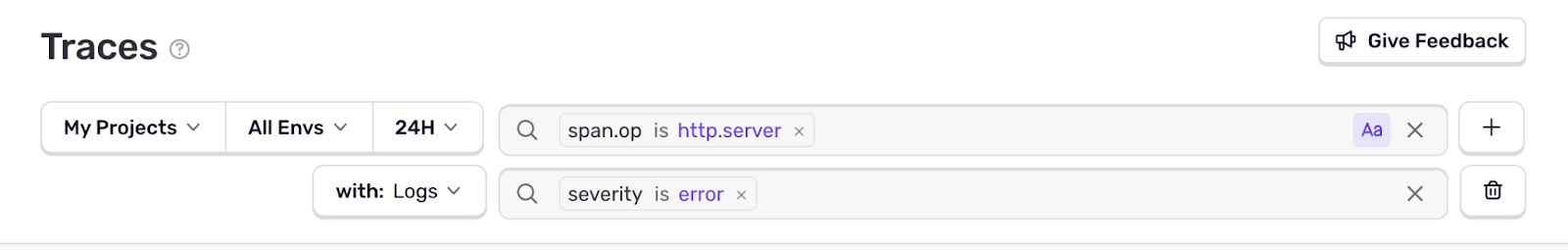 Cross-Event Querying lets you refine your search for spans by joining on additional Sentry event types connected by a trace (currently, span and log events are supported).